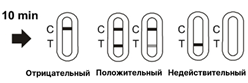 · Интерпретируйте результат через 5-10 минут. Результат после 10 минут считается недействительным.